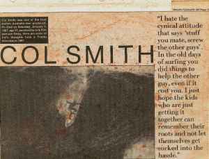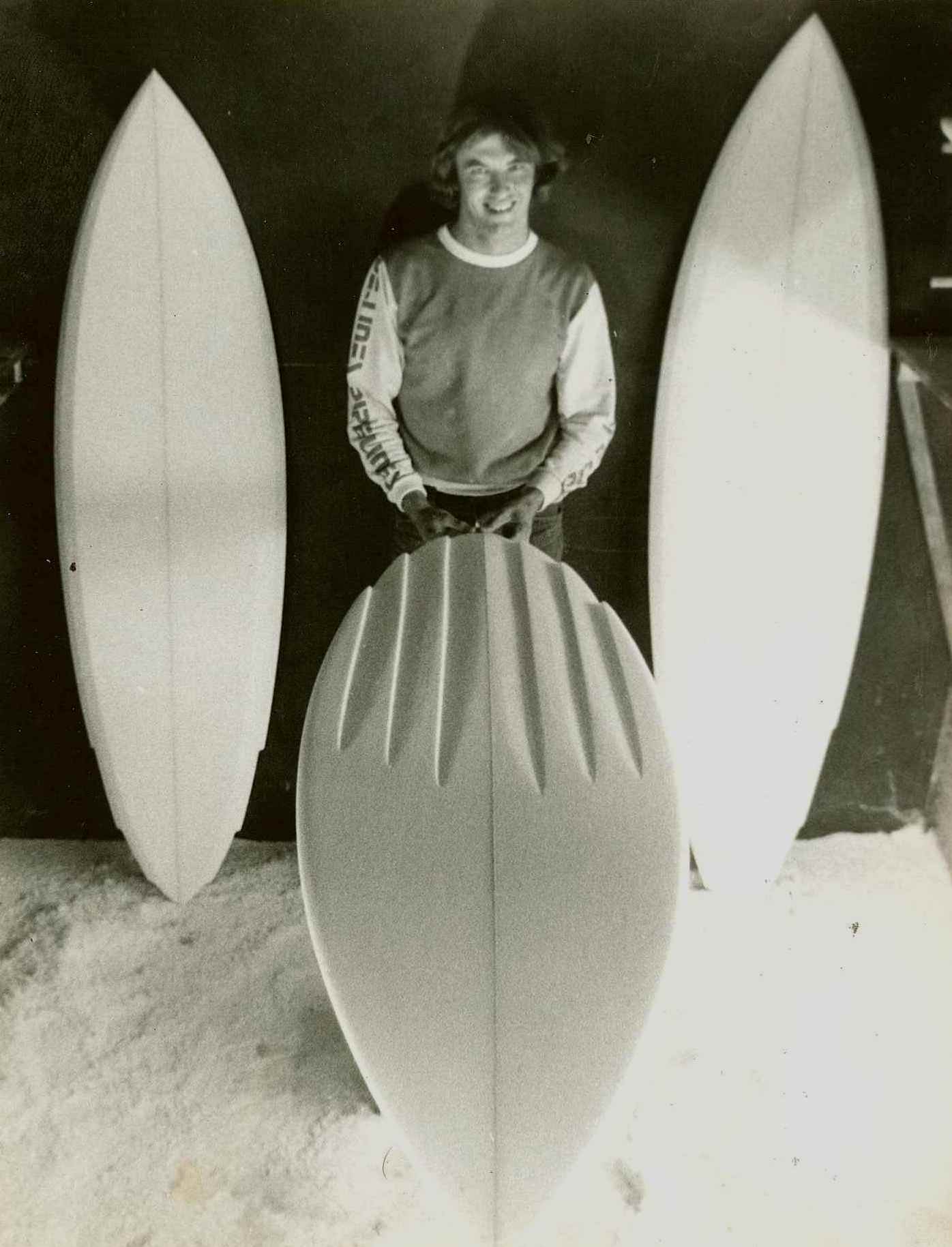 Col helped pioneer Channel Bottom Surfboards, first surfing Jim Pollard’s boards with the rolled edge “corrugated” style, then with Martin Littlewood Delta Designs making the hard edged Clinker channels, Col went on to making his own boards and also worked with other board builders, mostly shaping 6 channels with “Bee” tails.