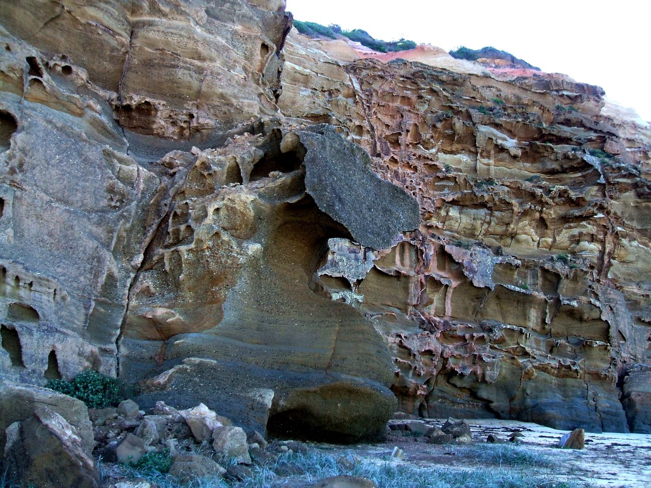 A close inspection of Redhead Bluff (not too close, there’s rocks falling off – like in Billy the Mountain) shows a Tubular Section in it, recent rain has done some corrosive damage and has hollowed out a literally tubular gnarly slab.Redhead Cliff with wave June 2010
