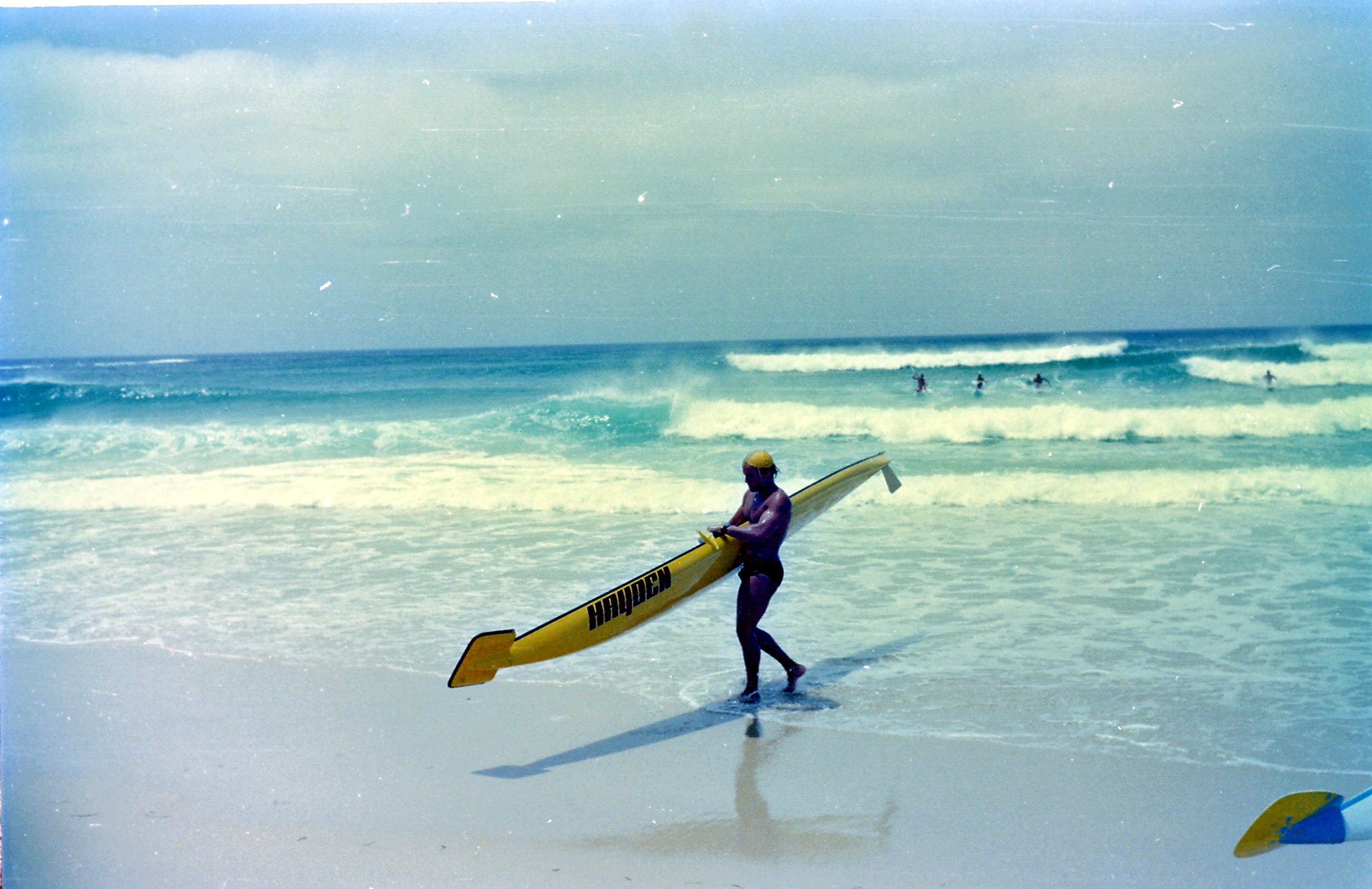The Redhead Boat crew were a fit lot and enjoyed their sport. Shown here cruising down a nice wave at Redhead around 1978.