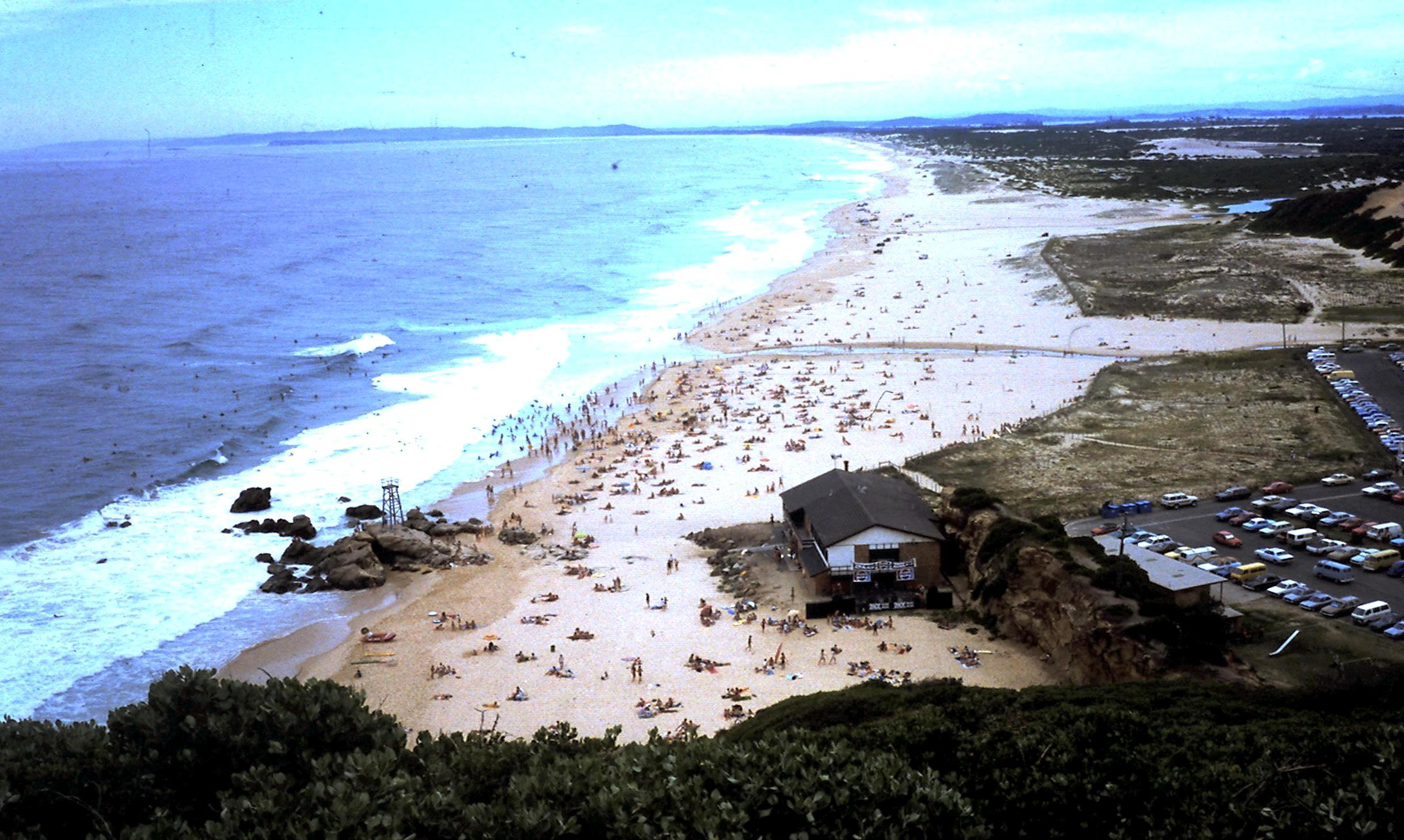 Redhead Beach on a crowded summer day showing Redhead surf club around 1978.
