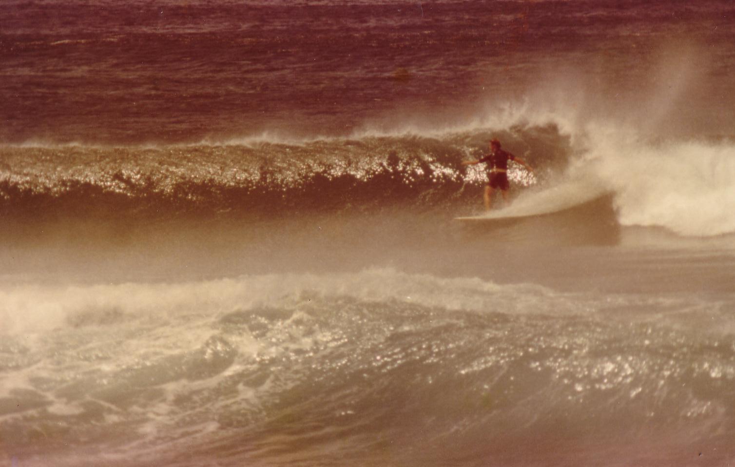 Here is Col Smith again in an excellent position, making getting a good  photo easy. These lefts next to the Redhead Shark Tower were solid this  day in 1976.