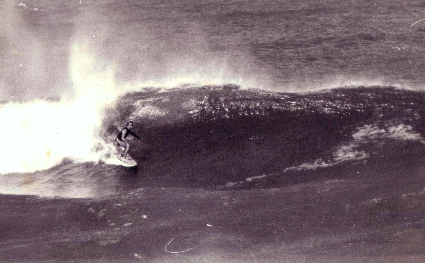 Peter Kuba jams a cutback on the inside rights next to Redhead Shark Tower around 1978.
