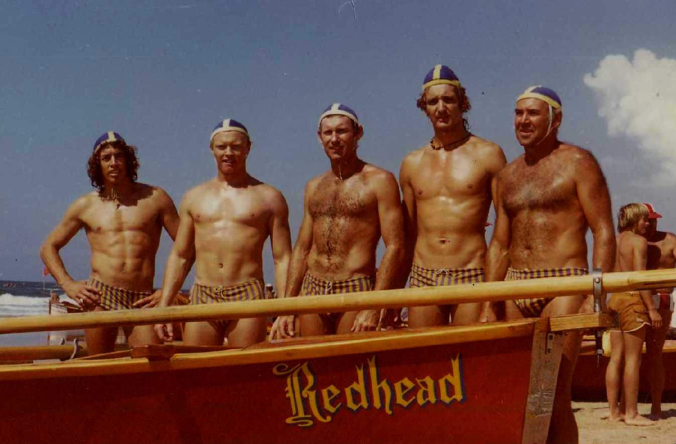 NSW SLSC Championships at Corrimal around 1978. This scantily clad and fit looking young lady onlooker caught the eye of Redhead’s boat crew. They asked me to go and take her photo and I said no, she would just tell me to piss off. Hard to say no to these blokes, as is evident from the next picture of them. So they picked me up camera bag and all and carried me armchair style to where she was sitting and dumped me in the sand at her feet. She willingly obliged to have her photo taken bemused by the proceedings.