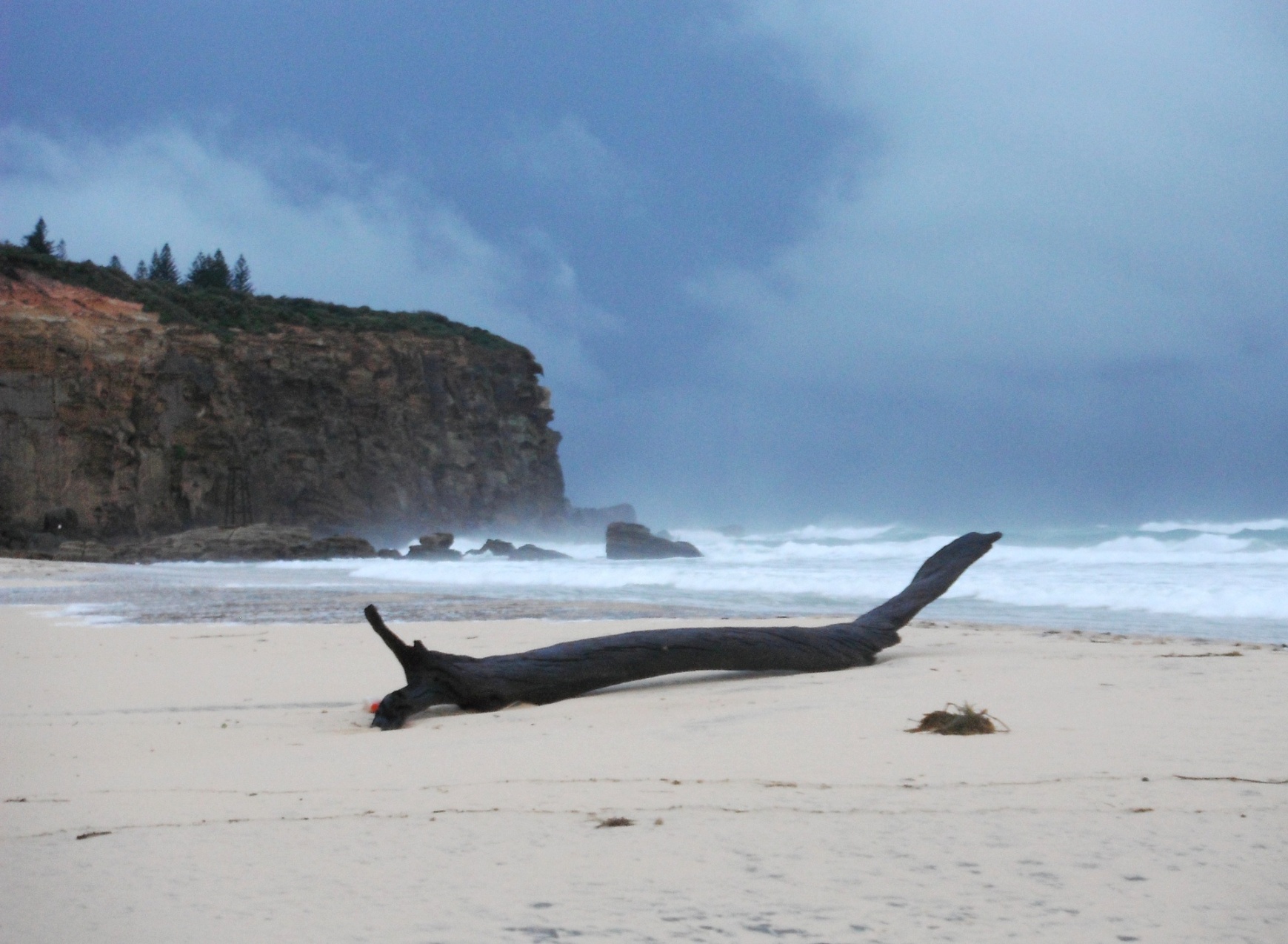 Redhead Beach seamonster 20/4/2013. A large tree washed up in big seas, looking rather like a beached sea Leopard, one beached up here many years ago.