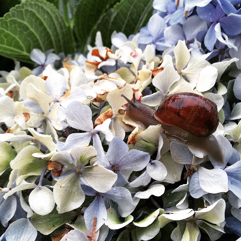 Snail on Hydrangeas December 2014 after the first rain for a while. Photo by my daughter Ellen.
