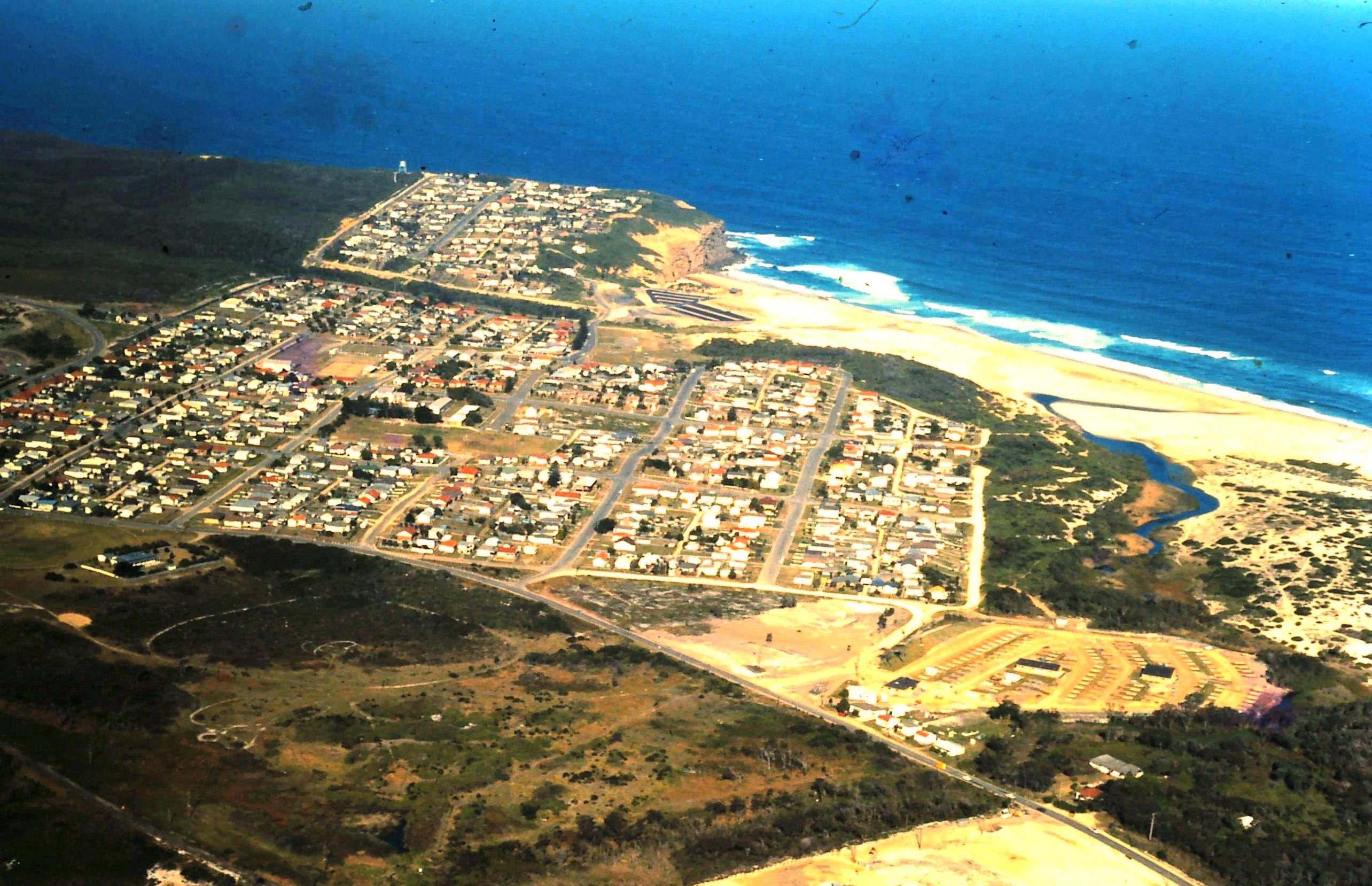 Arial view of Redhead 1976 from an old slide – Lots of changes in 40 years – no Industrial Estate , no north side housing estate, caravan park in progress, and the second creek before it got dried up.