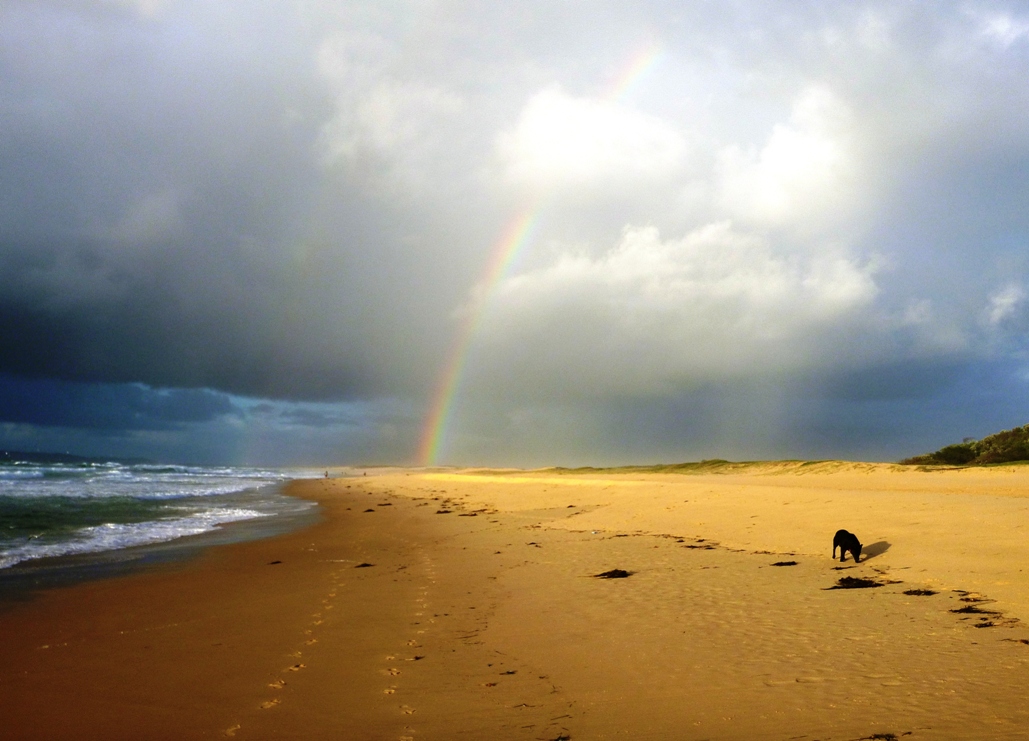 Rainbow over Redhead Beach 16/2/2021. With just my foot prints and Bonnie checking the tide line.